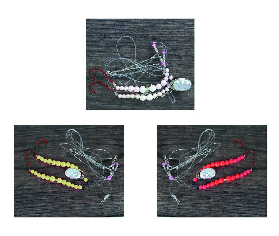 Brandungsvorfach mit Lockperlen und Löffel, ausgestattet mit 2 Red-Baitholder-Hooks. Die Perlenkette in Verbindung mit dem Locklöffel wirkt unwiderstehlich auf alle Plattfischarten. Verfügbar in den Farben Weiß, Rot und Gelb (fluo).