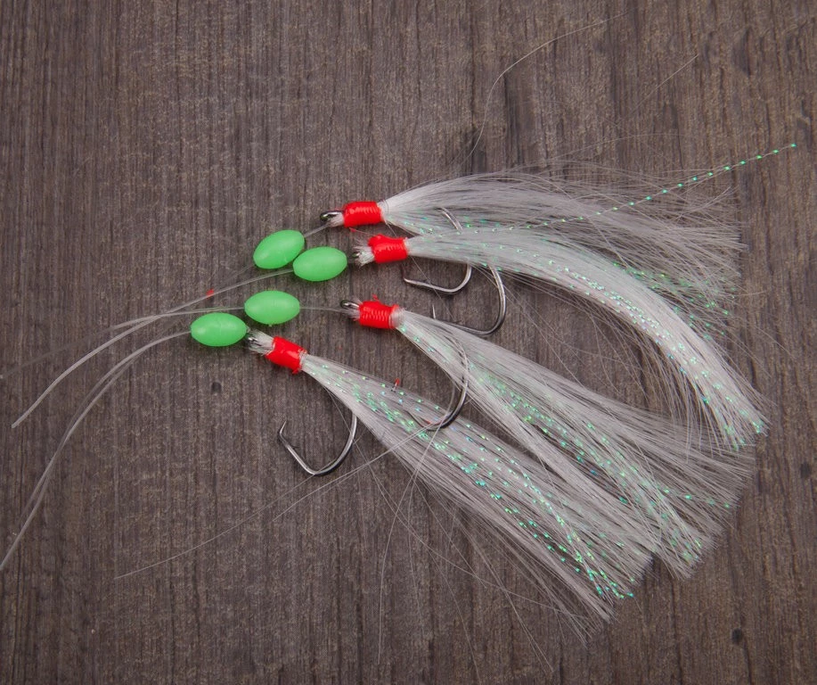 Dieses Makrelenvorfach ist mit vier Circle Hooks, Fluolockperlen und weißen Federn ausgestattet.