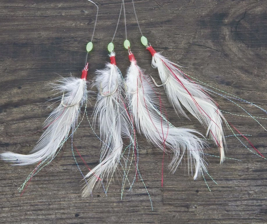 Dieses Makrelenvorfach ist mit 4 Cristal Haken und rot/weißen Tinsel ausgestattet.