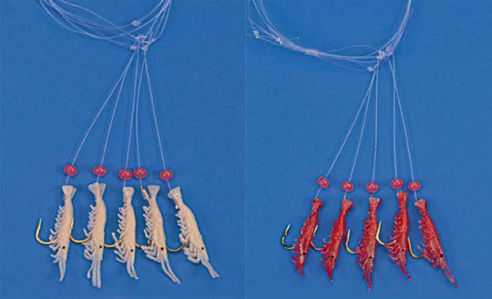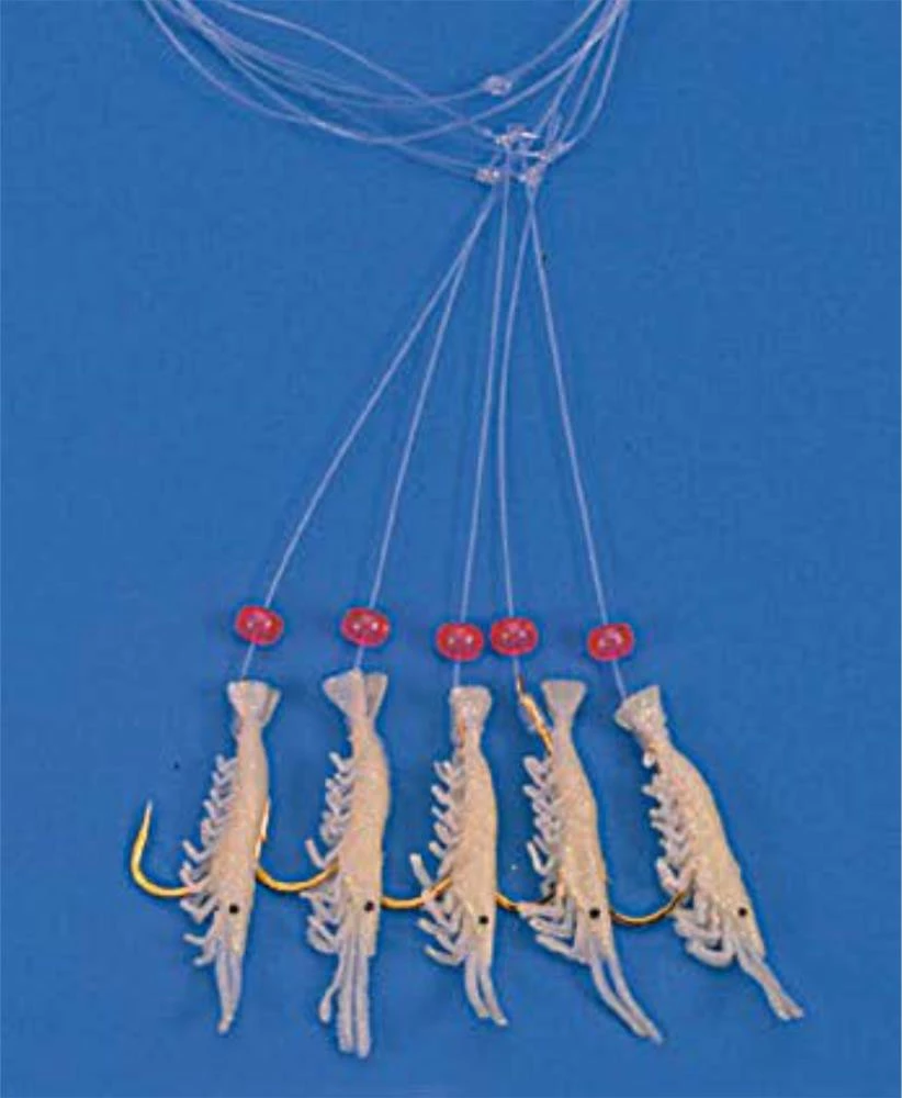 Dieses Vorfach-System besitzt 5 Goldhaken, die mit Mini-Shrimps verziert sind. Über den Haken sind rote Perlen befestigt. Die Haken haben eine Größe von 2. Der Schnurdurchmesser ist 0,40mm stark, bei einer Vorfachlänge von ca. 1,40m. Es stehen zwei verschiedene Farben zur Auswahl.