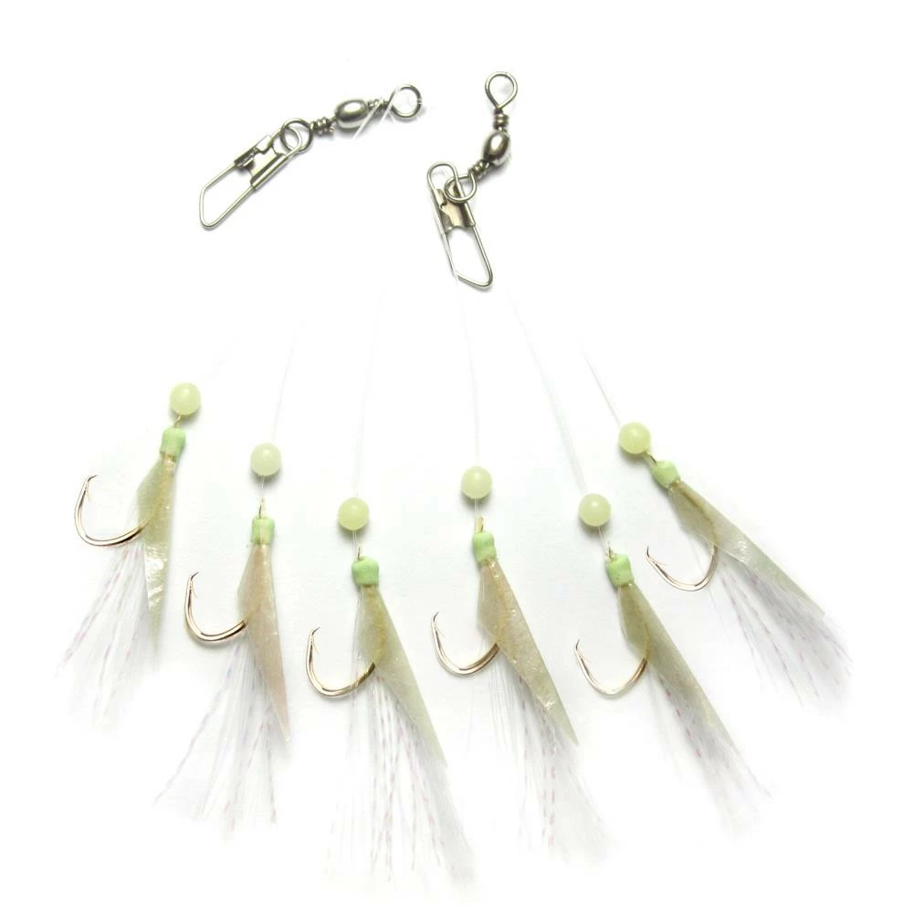 Diese Heringsvorfächer haben sechs Circle Hooks. Die Hakengröße ist 4. Diese sind an einer 12cm langen Mundschnur der Stärke 0,28mm befestigt. Die Hauptschnur mit einer Länge von 2,40m hat eine Stärke von 0,40mm. Die Haken sind mit echter Fischhaut und Fluo-Perlen verziert.