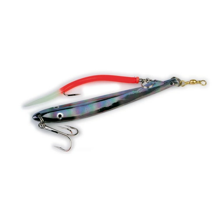 Dieser Bananen-Pilker ist mit einer holografischen Folie überzogen, die beim Absinken in die Tiefe durch den Lichteinfall und Drehung für unwiderstehliche Lockreize sorgt. DEr Pilker ist in Gewichten von 100g bis 400g verfügbar. Es gibt die Ausführungen mit oder ohne Makk-Beihänger.