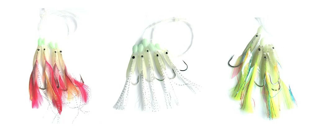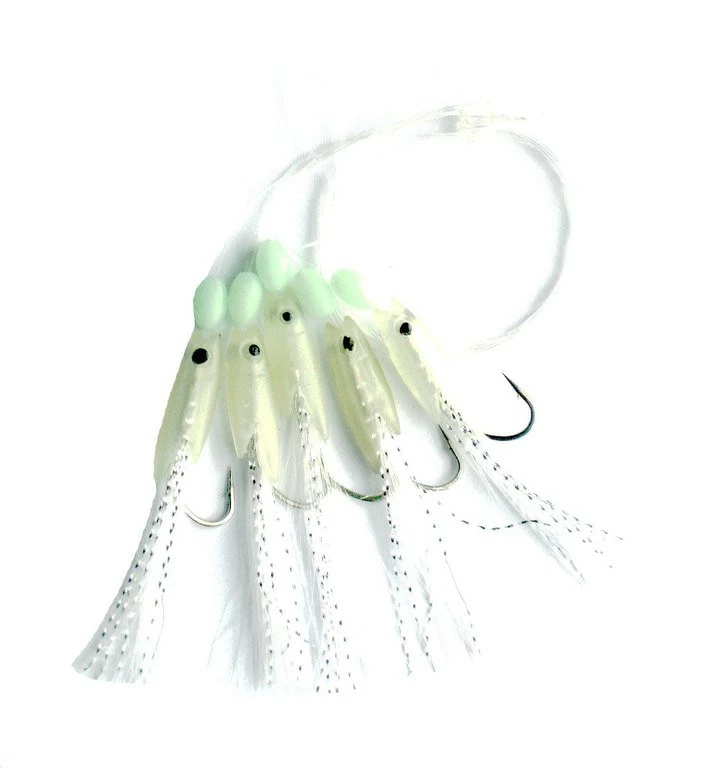 Dieses handgebundene Vorfach, mit selbstleuchtenden Lockperlen und kleinen Fischimitationen mit Tinsel, ist 1,40m lang. Es besteht aus 0,45mm starker monofiler Schnur und Haken der Größe 3/0. Es gibt drei verschiedene Farbvarianten, die sich in der Farbe der Tinsel unterscheiden.