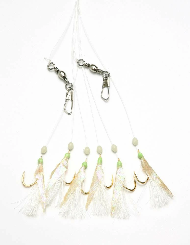 Das ist das ideale System für den Fang von Heringen und Makrelen. Es besitzt 6 Haken der Größe 4 die mit echter Fischhaut und selbstleuchtenden Perlen versehen sind. Angebracht sind sie an einer 0,28mm starken und 12cm langen Mundschnur. Die Hauptschnur hat eine Länge von ca. 2,40m bei einem Durchmesser von 0,40mm.