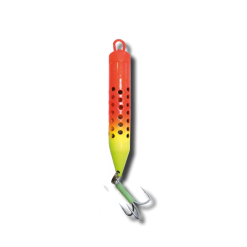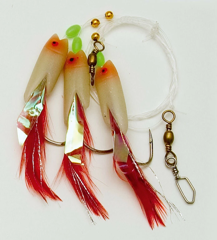 Dieses Rig besteht aus 3 Glo-Heads mit roten Federn und Silberfolie. Diese sind an einem Haken der Größe 8/0 montiert. Die Vorfachlänge beträgt 1,50m bei einer Stärke von 1,00mm.
