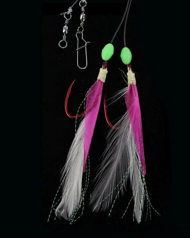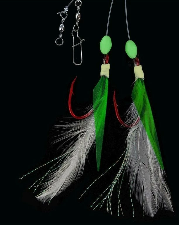 Das Vorfach besteht aus 2 Dorschfliegen, welche an einem Haken der Größe 8/0 montiert sind. Die Hauptschnur hat einen Druchmesser von 1,20mm und die Seitenarme von 1,00mm. Das Vorfach hat eine Länge von 150cm.