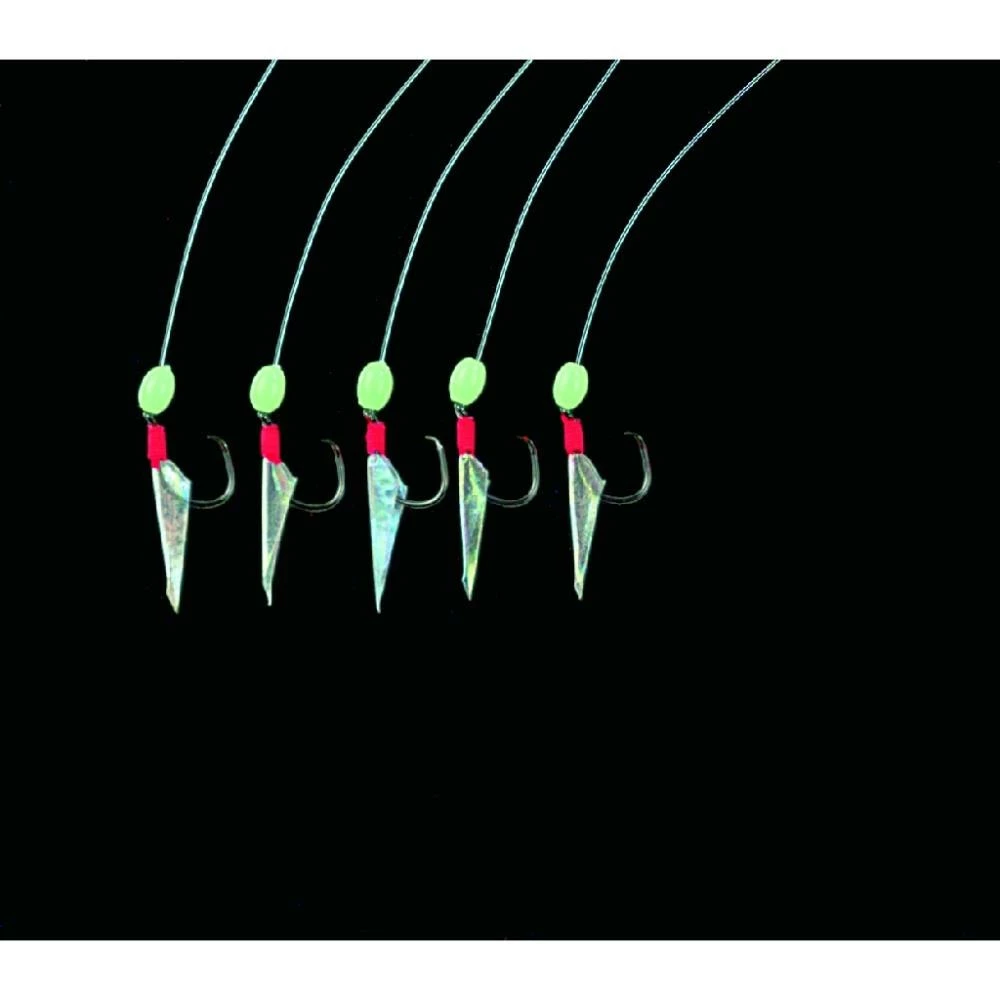 Dieses Heringsvorfach besteht aus 5 Seitenarmen mit Circle Hooks der Größe 6, die mit Fischhaut und Leuchtperle versehen sind. Die Schnur hat eine Stärke 0,40/0,30mm.