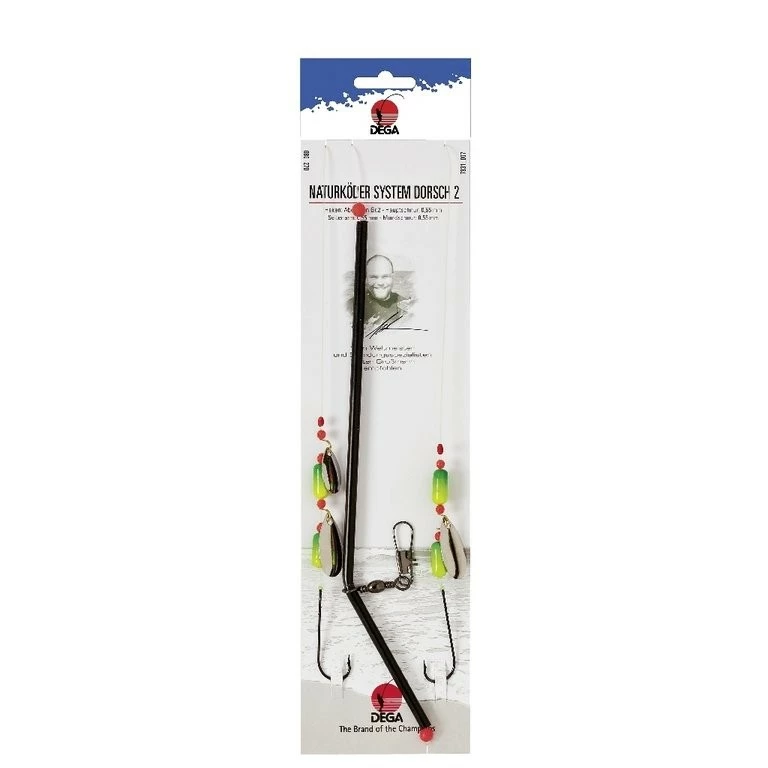 Diese Naturköder-Systeme sind konzipiert für die moderne Angelei vom Kutter oder Boot. Sie sind handgefertigt und von Qualitätskontrolleuren geprüft. Es gibt jeweils zwei Modelle für die Angelei auf Butt oder Dorsch. Die Vorfächer besitzen jeweils zwei Haken der Größe 1, eine Schnurstärke von 0,60mm/0,50mm, ein Running Boom und verschiedenfarbige Spinnerblätter und Lockperlen.