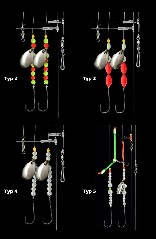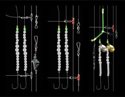 Dies ist ein attraktives und sehr fängiges Naturködervorfach für das Angeln vom Boot und Kutter. Es ist ausgestattet mit leuchtenden Perlen und Spinnerblättchen. Die Länge des 0,50mm starken Vorfaches beträgt 120 cm und ist mit zwei Haken der Größe 2 ausgestattet. Die Lieferung erfolgt auf praktischem EVA-Brettchen. Es stehen vier verschiedene Varianten mir unterschiedlichen Perlen und Spinnerblättchen zur Verfügung.