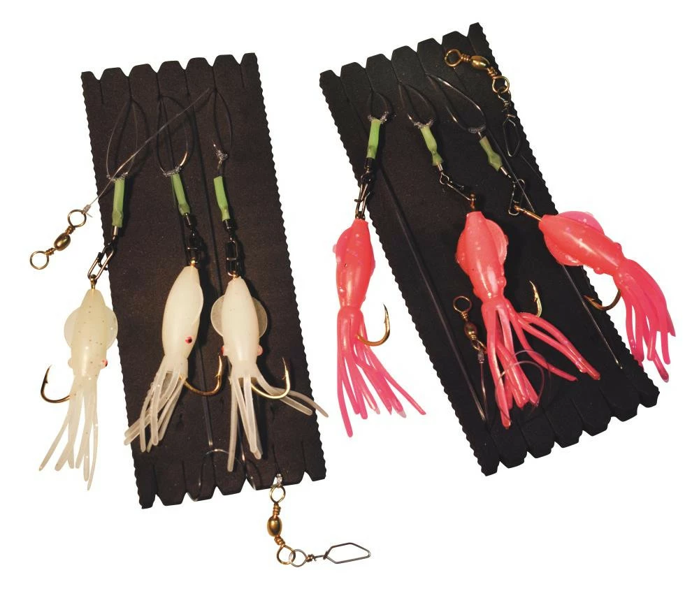 Dieses System für den Fang von Wittlingen verfügt über kleine Oktopusse an einem gold glänzendem Einzelhaken in Größe 3/0. Über eine Wassersäule von 1,20m (im Abstand von 40cm) lässt sich der Wittling damit optimal befischen. Ein weiterer Leuchtpunkt macht das System noch attraktiver für den Fisch und durch den Schnellwechselwirbel können wir gefangene Fische ggf. einfach aushängen. Das System ist in zwei Farben erhältlich.
