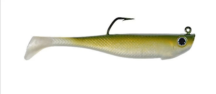 Dieser Gummifisch besitzt einen integrierten Bleikörper. Er besitzt einen Paddelschwanz, der für ordentlich Druck sorgt. Erhältlich ist der Jig in den Farben oliv-pearl und blue black. Bei einer Größe von 15cm (6.5 inch) ist er in 115g, 140g und 170g erhältlich.