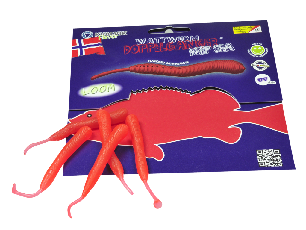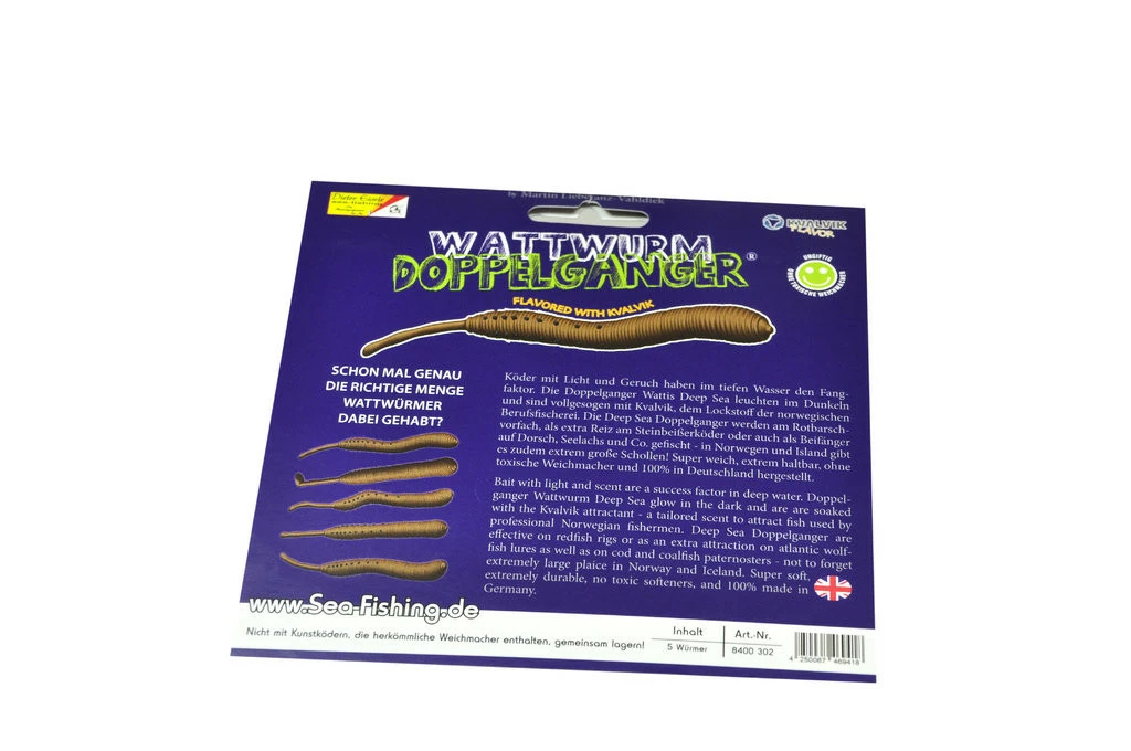 Wer kennt das nicht der Angeltag läuft und die Fische beißen. Es kommt die Zeit, wo dei vorhandenen Wattwürmer alle sind oder diese schlecht erhältlich sind. Für diesen Fall hat Eisele den Wattwurm Doppelgänger entwickelt. Dieser Köder setzt neue Maßstäbe im Kunstköderbereich. Dieser innovative Wurm sieht nicht nur aus wie ein echter WAttwurm, sondern ist auch mit dem revolutionärem Lockstoff der Norwegischen Berufsfischer „Kvalvik“ vollgesogen. Diese Würmer bestehen aus sehr haltbaren, leicht auftreibenden, PVC und phthalatfreien, nicht abfärbenden Material ohne toxische Weichmacher. Der Köder ist 1000 mal haltbarer als andere Gummiköder. Er hat eine Länge von 8cm. In jeder Packung sind 4 Watties und 1 Turbo-Tail enthalten. Die Größe dieser Wattwurm Doppelgänger gibt es in vier Farben, wobei drei (Deep Sea) speziell für die Angelei auf Rotbarsch, Steinbeißer oder auch Dorsch und Seelachs gedacht sind. Diese drei Farbvarianten leuchten extra im Dunkeln. Der Wuttwurm Doppelgänger ist Made in Germany und eine echte Alternative für das Original in Ost- und Nordsee, sowie für Norwegen und Island.