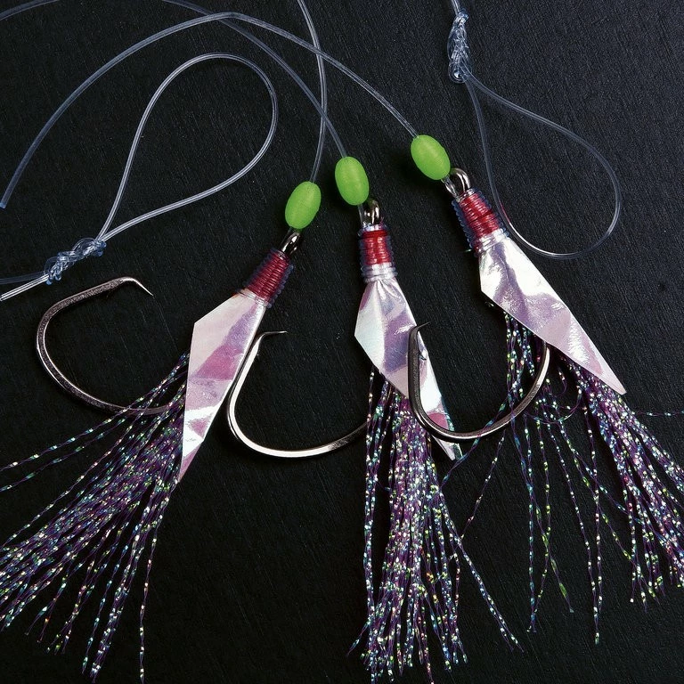 Dieses Vorfach besteht aus drei Circle-Hooks der Größe 3/0. Montiert ist alles auf einer 0,60mm starken und 150cm langen monofilen Schnur. Die Haken sind mit silberglänzenden Federn und Folie verziert. Vor jedem Haken sitzt eine ovale Leuchtperle.