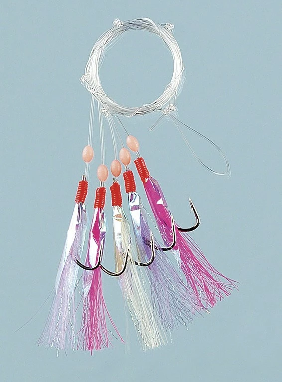 Vorfach mit 5 Haken, die mit lila, rosa und gelben Federn bestückt sind. Diese sind an einer 0,60mm starken monofilen Schnur befestigt. Je nach Größe der Haken eignet sich dieses Vorfach für Hering, Makrele, Dorsch und Seelachs.