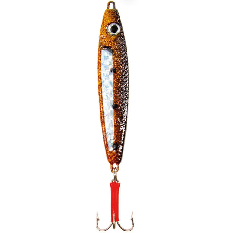 Dieser Pilker ist bleifrei. Er ist in sechs Farben und 6 verschiedenen Gewichten verfügbar. Er ist in den Farben Blau-Silber, Grün-Silber, Gelb-Silber, Orange gepunktet, Blau gepunktet und Gold-Schwarz gepunktet lieferbar. Die Gewichte gehen von 30g – 200g.