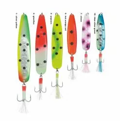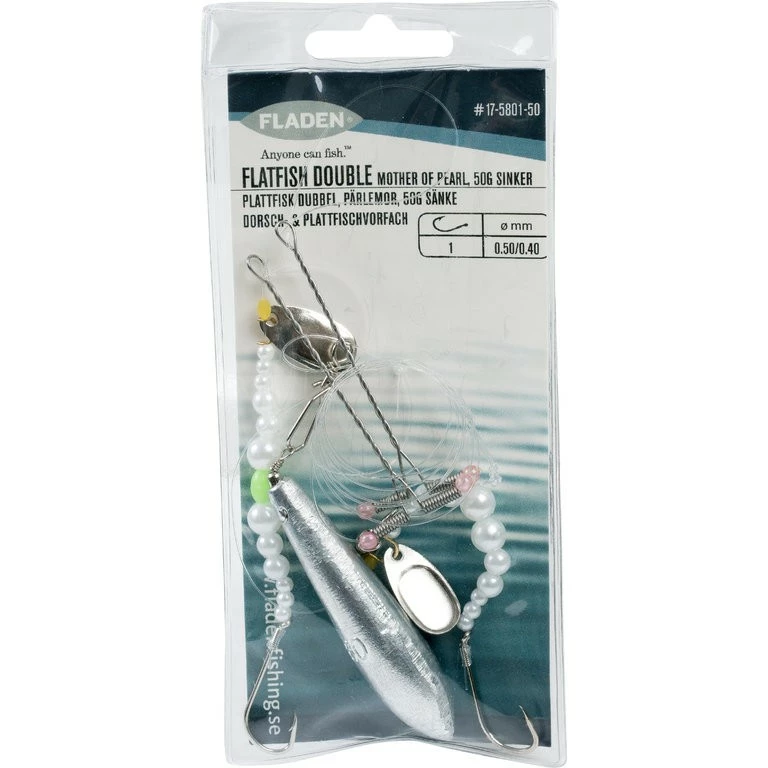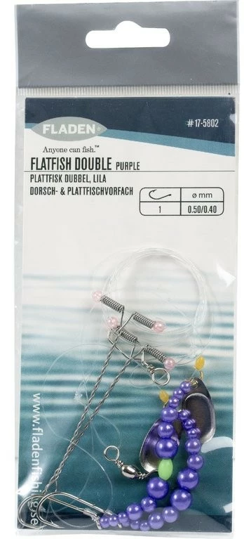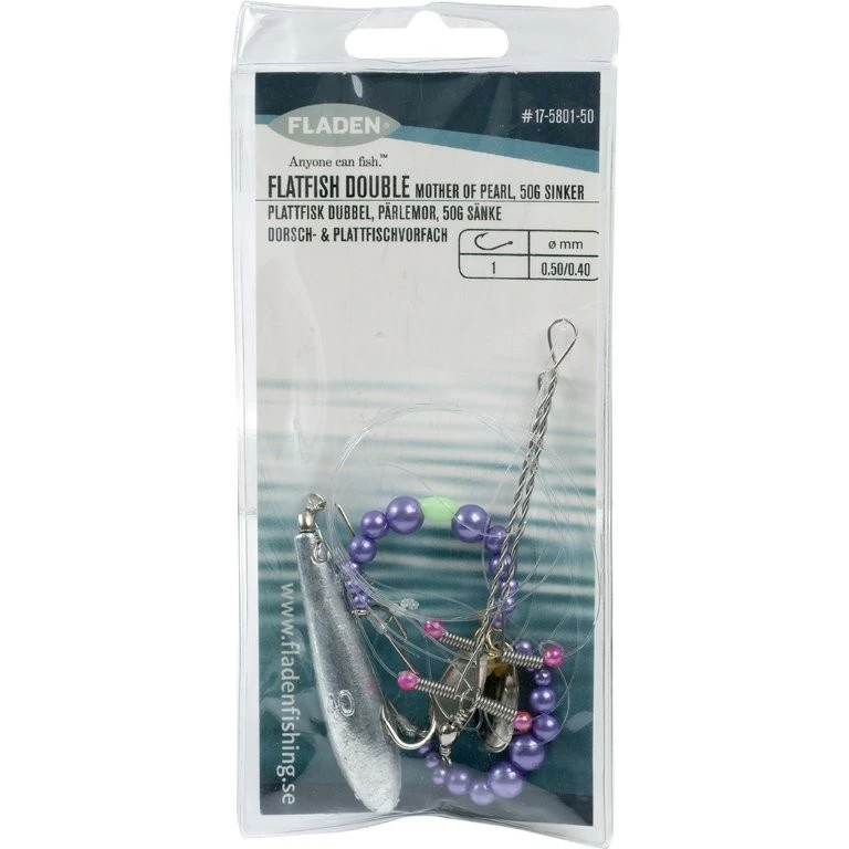 Dieses Plattfischvorfach gibt es mit oder ohne 50g Gewicht. Das Rig besteht aus zwei Haken der Größe 1. Die verwendete Hauptschnur hat eine Stärke von0,50mm. Es gibt das Vorfach mit weißen oder lilafarbenen Perlen. Weiter besitzt das Vorfach Abstandshalter und Spinnerblätter.