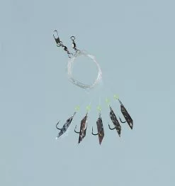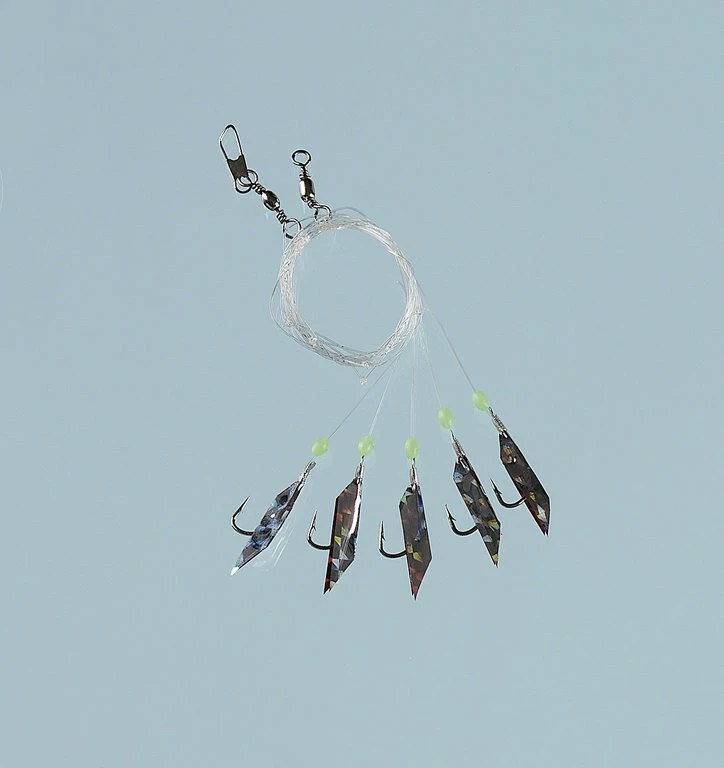Dieses Herings- und Makrelensystem besteht aus 5 Haken der Größe 6 bzw. 3/0. Diese sind mit silberroter Holofolie verziert. Die Hauptschnur des Rigs mit Hakengröße 6 beträgt 0,40mm und dient dem Fang von Heringen, während das Vorfach mit Hakengröße 3/0 dem Fang von Makrelen dient und eine 0,60mm starke Hauptschnur besitzt.