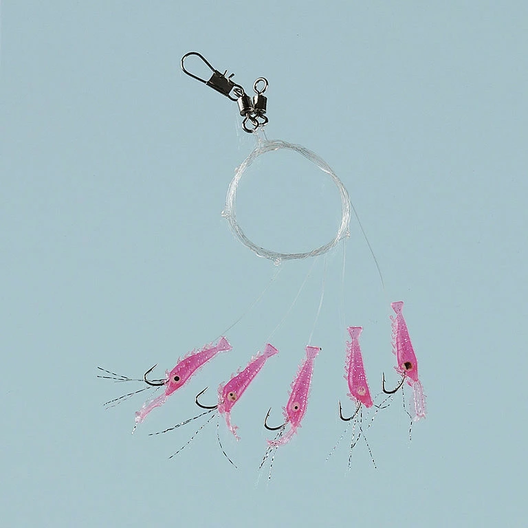 Dieses Herrings- und Makrelensystem besteht aus 5 pinkfarbenen Shrimps, welche an fünf Haken der Größe 6 bzw. Größe 1/0 montiert sind. Die Hauptschnur der besteht bei dem System mit Hakengröße 6 aus 0,40mm starker monofilen Schnur, während die Schnurstärke bei Hakengröße 1/0 0,46mm beträgt.