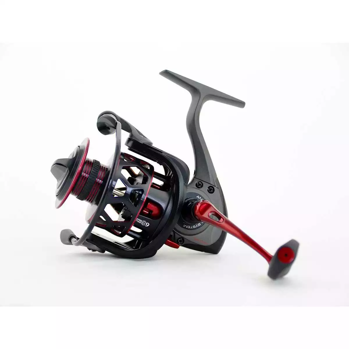 Ihre Ausstattung besteht aus einem schnittigen 6+1 Kugellager, ein verwindungssteifer Graphitkörper und Rotor, eine mit einem Gummiring versehene Aluminiumspule und ein mit einem Softtouchgriff ausgestatteten Kurbelarm.
