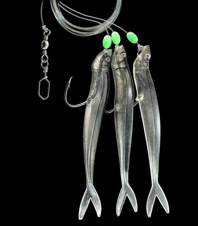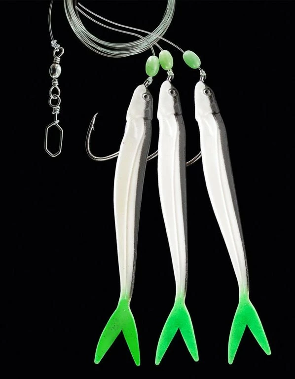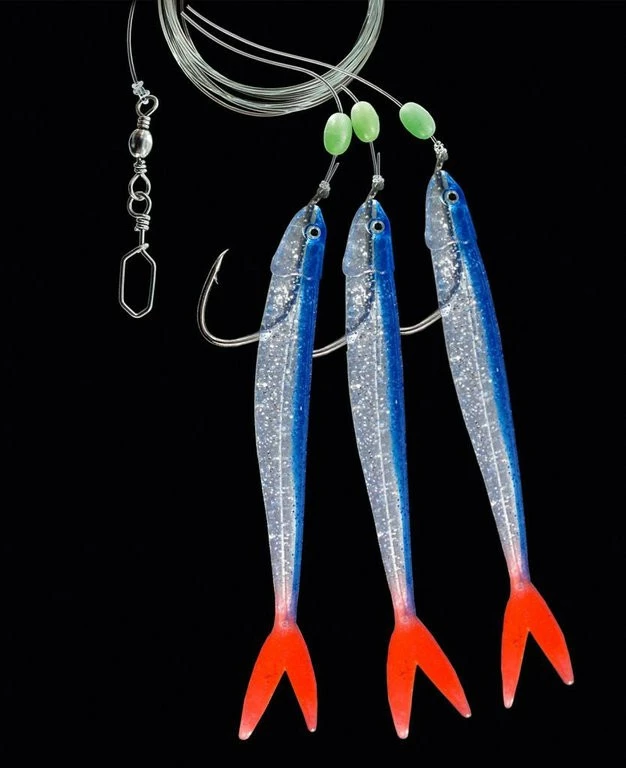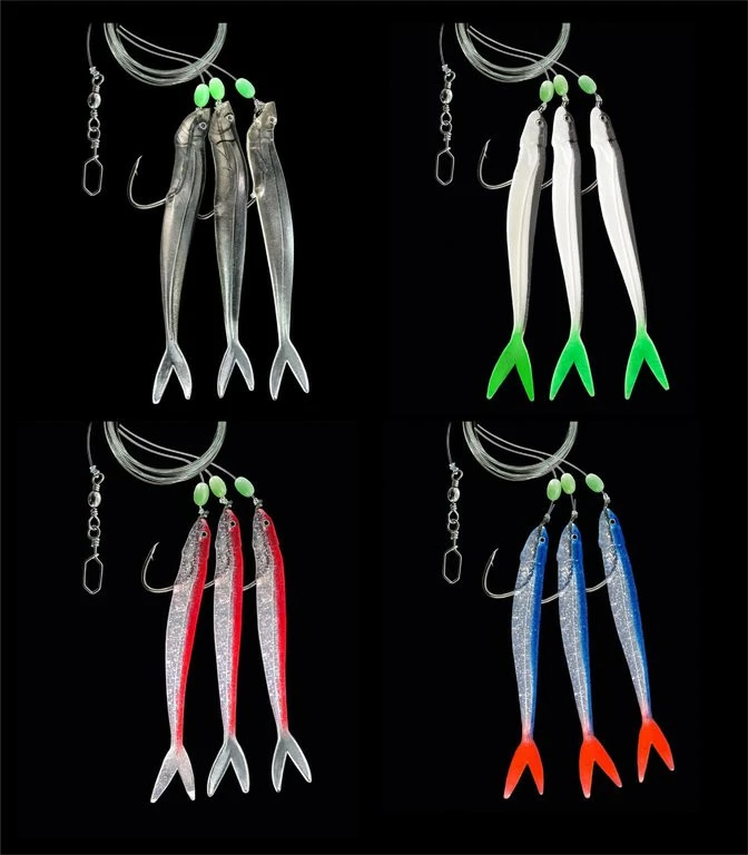 Dieses fängiges Paternoster ist mit drei Gummifisch-Beifängern ausgestattet. Es befindet sich an einer 160cm langen und 1,00mm starken Hauptschnur. Die Seitenarme sind an 0,70mm starker monofilen Schnur befestigt. Die Haken sind kräftigen und haben eine Größe von 4/0.