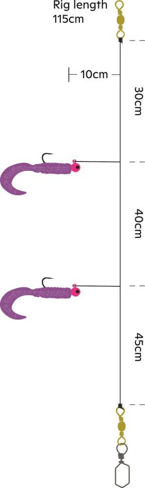 Diese einzigartige System verfügt über zwei klassische Twister mit schweren Zinkköpfen, effektiven UV-Farben und starken Haken. Mit den schweren Köpfen bewegt und fischt sich diese Montage absolut einzigartig