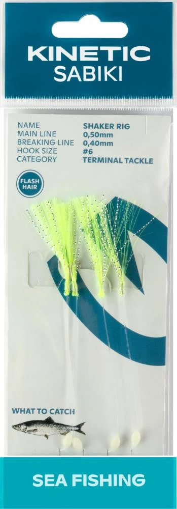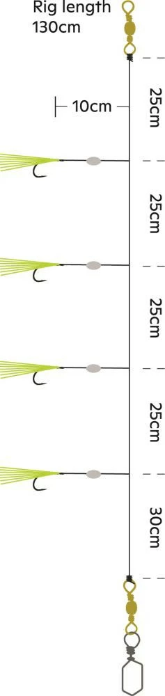 Vier kleine und starke Haken vervollständigen dieses robuste Sabiki-Vorfach. Steife Haare und robuste Mono machen es zu einer starken und effektiven Kombination.