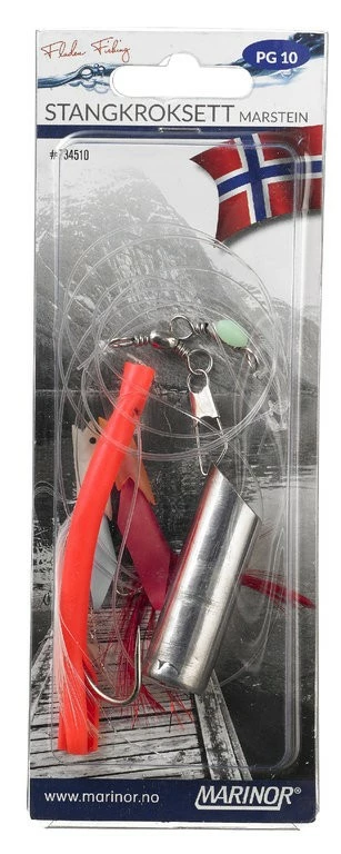 Dieses Vorfach ist 120cm lang, besitzt drei Haken, an denen zwei kleinen Gummifischen in pink und fluo und eine roter Gummischlauch befestigt sind, und beinhaltet bereits eine Gewicht. Ideal für Dorsch, Makrele und Seelachs.