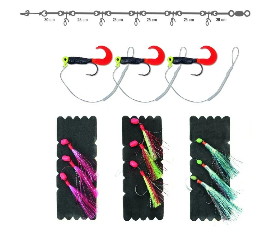 Mit dieser revolutionären Vorfach-Schnellwechsel-Methode, dem Mustad Fastach Leader System, sind Sie in der Lage in wenigen Sekunden Ihre Montage zu wechseln. Es ist also möglich verschiedenfarbige Jigs in die Vorfachschnur einzusetzen, um festzustellen, auf welche Farbe die Fische gerade stehen. Sollte sich eine spezielle Farbe herauskristalisieren, so können in Sekundenschnelle die anderen Jigs gegen die fängige Farbe ausgetauscht werden. Die hat natürlich den Vorteil, dass Sie nicht verschiedene Vorfächer mit verschiedenfarbigen Jigs mitführen müssen, sondern nur eine Main Line und entsprechende Einhänger. Die Mundschnüre sind alle mit einem Mustad Ultrapoint Haken geknotet und werden auf einem praktischen Aufwickler geliefert. So haben Sie immer Ordnung in Ihrer Ködertasche.
