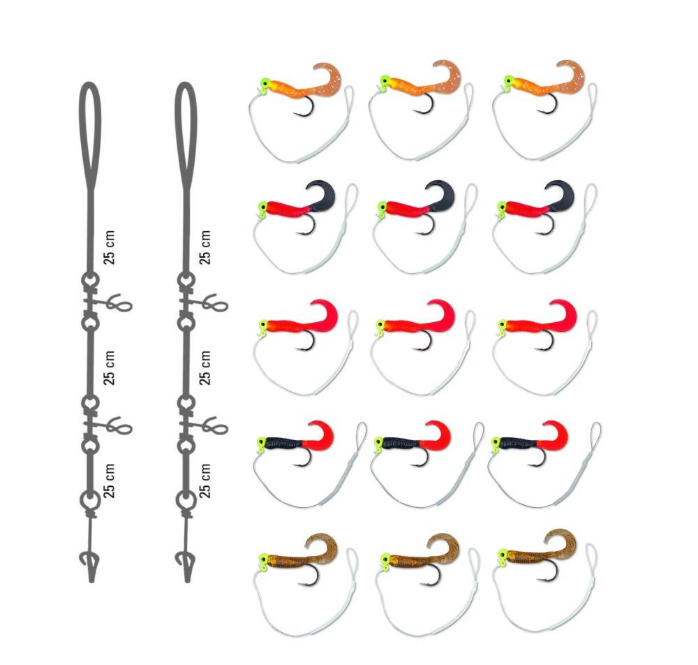 Dieses Set besteht aus 2x Fastach Mainline mit einer Länge von 75cm und zwei Konnektoren, sowie 5x Fastach Cod Rig in Red/Black, Orange, Black/Red, Motoroil und Rot mit jeweils 3x Twistern. Sie erhalten dieses Set zu einem Super-Preis und können somit diese erfolgreichen Köder bei Bedarf austauschen. Sie können weitere Köder im Shop erhalten und gegen diese Twister austauschen. Somit können Sie auch zwei verschiedene Köder an der Mainline befestigen.