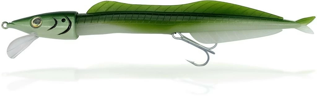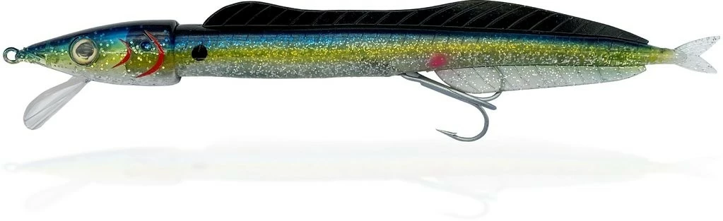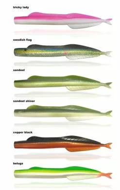 Mit dem Rhino Sandaal-Baitholder ist es möglich, sowohl Sandaale aus Gummi (im Lieferumfang enthalten) als auch entsprechende Naturköder einzusetzen. Beim Einsatz echter Sandaale wird das Haken-Rig von hinten durch die Kiemen durch das Maul geführt und in der Öse im Kopf gesichert, während der Haken an der Flanke eingestochen wird. Die Sicherung des Köders in Kopf erfolgt mit einem Zahnstocher. In der ausgelieferten „ready to fish“-Variante ist bereits ein naturgetreuer Sandaalschwanz montiert. Sein Laufverhalten ähnelt dem eines natürlichen Sandaals sehr, je nach Anströmung schwänzelt er nicht nur, sondern bricht ab und an seitlich aus – bis hin zu einer ganzen Rolle um die Längsachse. Dieses Laufverhalten scheint den Räubern sehr zu gefallen, denn unzählige Fische wurden schon in der Testphase überlistet. Die Attacken waren teilweise so hart, dass vom System nur noch der Kopf aus dem Maul herausschaute. Ideal einzusetzen bei Geschwindigkeiten zwischen 1,5 und 2,5 Knoten. Die Ersatzschwänze sind auch einzeln zu erhalten. Der Köder ist 20cm lang und 25g schwer.