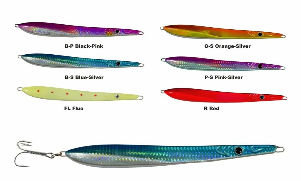 Dieser fängige Pilker besitzt eine leicht gebogene Form. Seine Bewegungen sorgen für die entsprechende Reize, die die Fische zum Biss verleiten. Diesen Pilker gibt es in sechs fängigen Farben. Die Gewichte reichen von 150g – 300g. Die Pilker werden mit montierten Salzwasser-Drillingen geliefert.