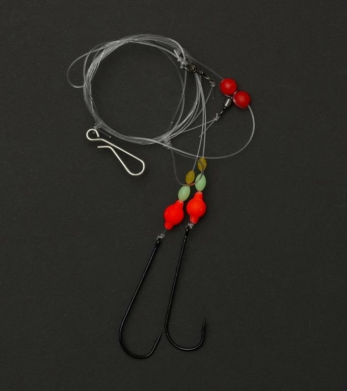 Dieses Plattfischvorfach hat eine Länge von 75cm und besteht aus einer 0,55mm starken monofilen Hauptschnur und einer 0,35mm Mundschnur. Die Hakengröße beträgt 2/0.