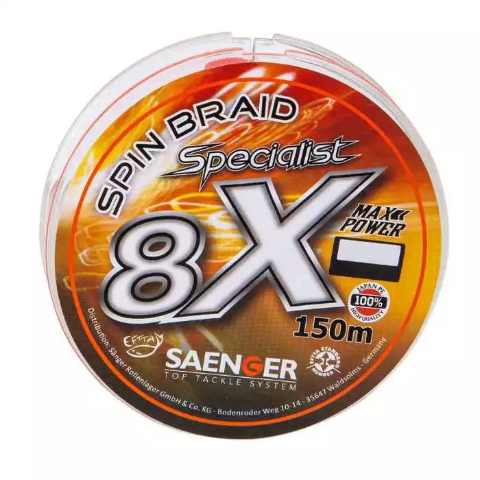 Unsere Sänger 8 X Specialist Spin Braid ist eine 8-fach geflochtene Hochleistungsschnur der Spitzenklasse, die von Teamanglern ausgiebig getestet und von den besten Schnurspezialisten der Welt hergestellt wurde. Bevor die Produktionsstätte verlassen wird, wird diese Schnur einem computergesteuerten Prüfverfahren unterzogen und anschließend vom Qualitätsmanagement abgesegnet. Durch die enge Flechtung wird vermieden, dass die Schnur Wasser aufnehmen kann und ermöglicht weite Würfe, gerade beim Spinnfischen. Eine extrem weiche und glatte Oberfläche sind außerdem Kennzeichen der neuen Sänger 8 X Specialist Spin Braid. Die stark leuchtende, orange Farbe der Schnur ermöglicht eine perfekte Sichtbarkeit, gerade auch bei schlechten Wetterverhältnissen.