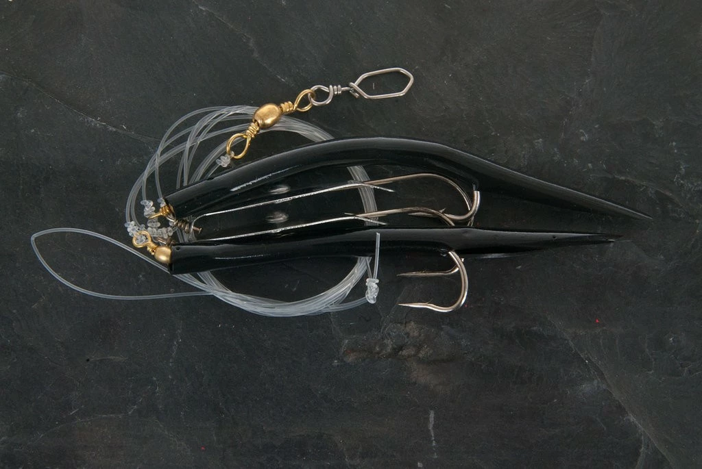 Dieses Pilkvorfach besteht aus zwei schwarzen Gummi-Makks und und zwei Makrelen-Blinkern. Die Hakengröße beträgt 4/0.