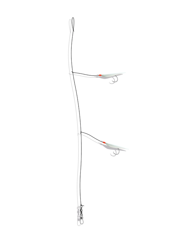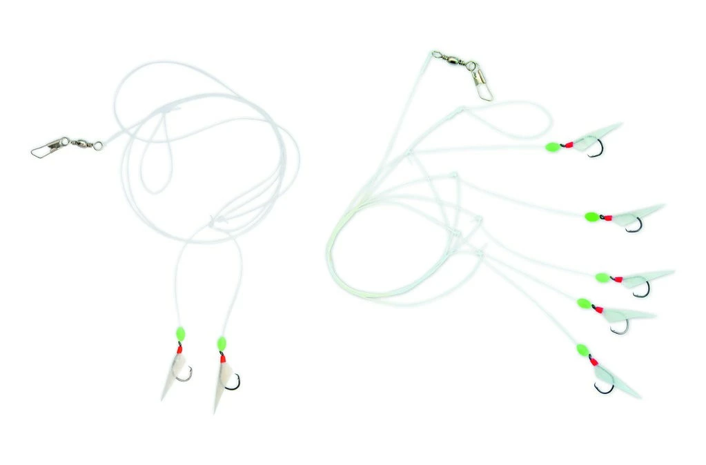 Dieses Vorfach ist in zwei Versionen, einmal mit 2 und einmal mit 5 Haken, verfügbar. Die Haken haben die Größe 6 und sind mit echter Fischhaut verziert. Bei den Haken handelt es sich um goldene Circle Hooks, damit sinkt die Aussteigergefahr. Die Länge des Vorfaches ist 80cm (2 Haken) bzw. 100cm (5 Haken). Die Hauptschnur hat eine Stärke von 0,40mm und die Vorfachschnur von 0,30mm.