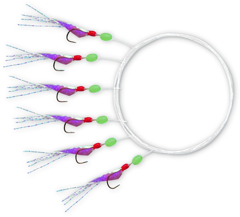 Dieses Vorfach besteht aus 6 Haken der Größe 10 bzw. 12. Die Haken sind mit echter Fischhaut verziert und vor diesen befindet sich je eine Fluoperle. Die Hauptschnur hat eine Stärke von 0,35mm.
