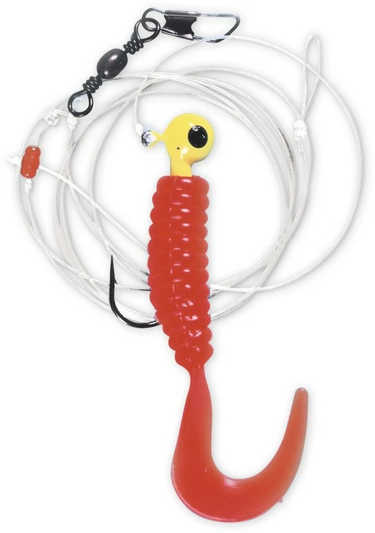 Dieses Einzel-Twister-Vorfach besteht aus einem roten 6,5cm großen Twister, welcher an einer 0,65mm starken Vorfachschnur montiert ist. Das Vorfach ist an einer 0,70mm starken Hauptschnur befestigt. Dieses Vorfach gibt mit Hakengröße 1/0 und 3/0.