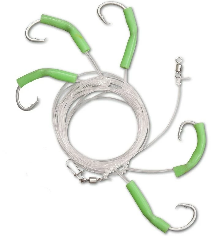 Dieses Rotbarsch-Vorfach besteht aus 5 Einzelhaken Systemen mit je einem Einzelhaken der Größe 7/0 für eine Garnele oder Fischfetzen, sowie einem Leuchtschlauch an jedem Haken. Die Hauptschnur hat ein Stärke von 1,00mm mit einer Tragkraft von 50Kg. Die Gesamtlänge beträgt 500cm. Das Vorfach ist ideal für das Bootsangeln auf Rotbarsch. Die Lieferung erfolgt auf einem runden Aufwickler.